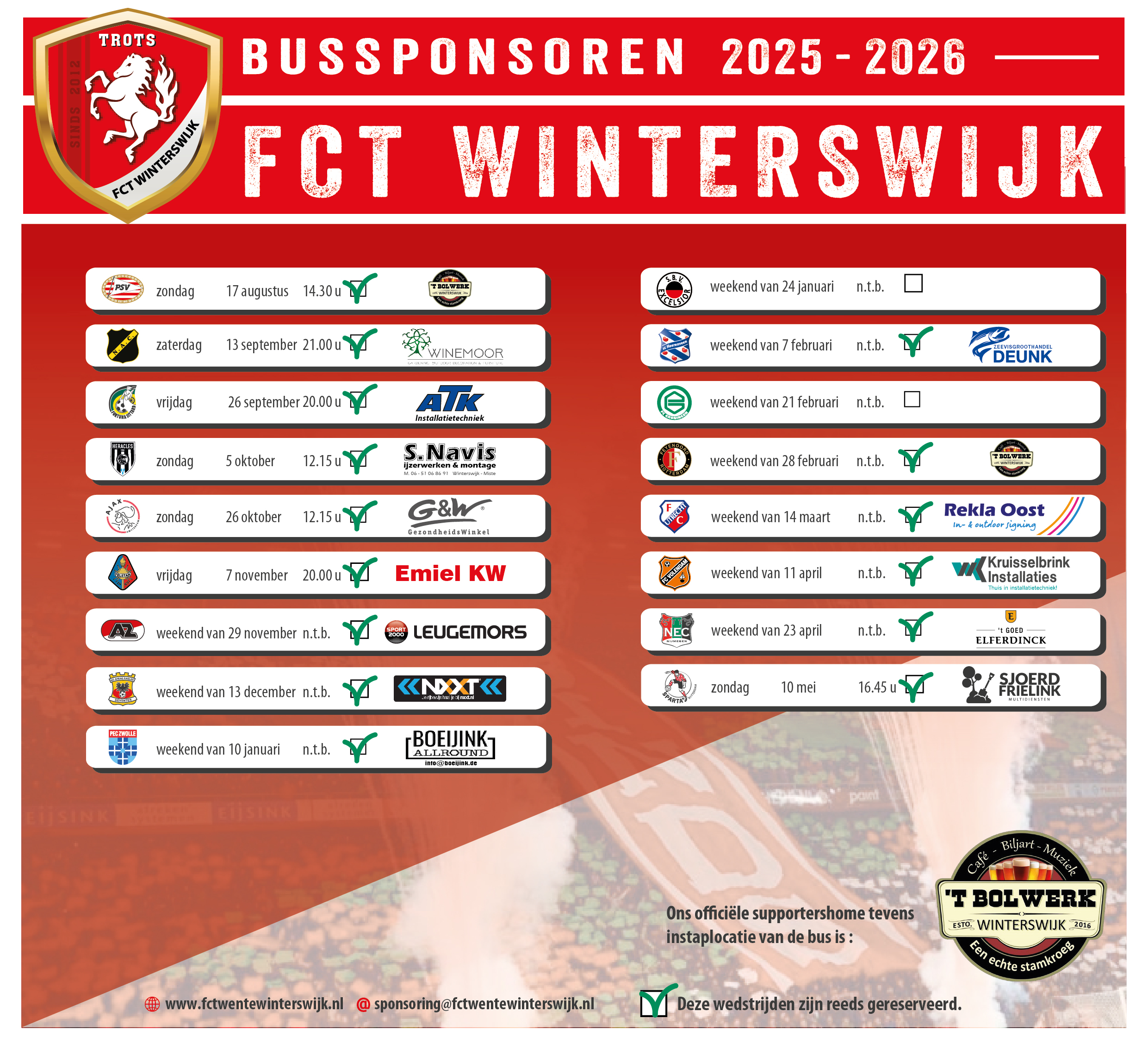 Onze bus sponsoren voor seizoen 2025-2026. Er zijn nog enkele plekken vrij. Wil je meer informatie of bussponsor worden? Neem contact op met sponsoring@fctwentewinterswijk.nl.