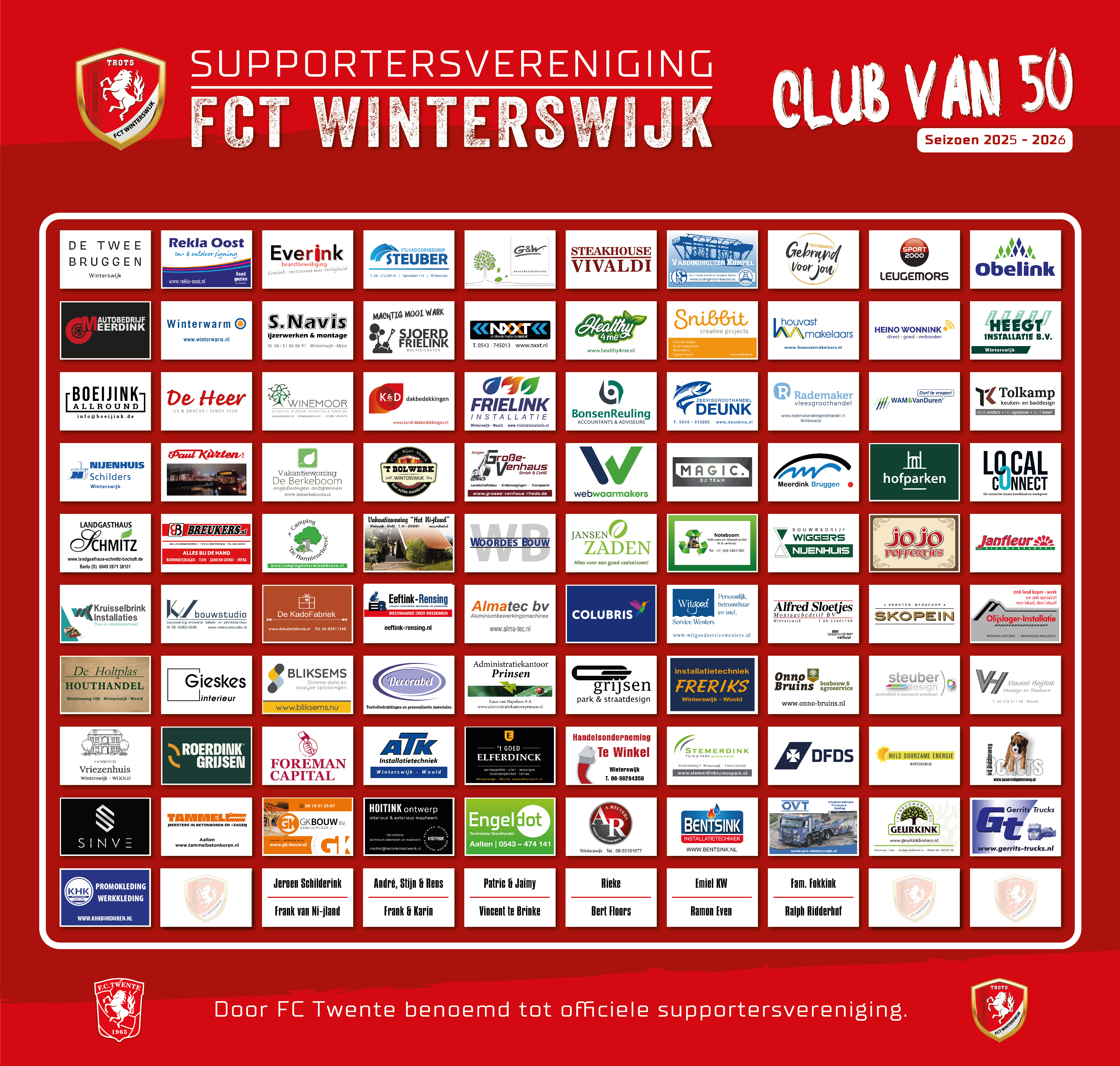 De Club van 50 is een groep van ruim honderd bedrijven en particulieren die FC Twente, FC Twente Winterswijk en de lokale voetbaljeugd een warm hart toedraagt. Met de financiële bijdrage die zij leveren, worden maatschappelijke doelen ondersteund die niet binnen de normale begroting vallen. Informatie of lid worden? Neem contact op met sponsoring@fctwentewinterswijk.nl.